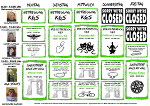 In unserem Jugendtreff sind alle Kinder und Jugendliche im Alter von 10 bis 21 Jahren herzlich willkommen! Hier seht ihr unsere Öffnungszeiten sowie welche MitarbeiterInnen wann für euch da sind. Während der Öffnungszeiten könnt ihr bei uns kickern, Billard und Tischtennis spielen, Playsstation zocken und Brettspiele spielen. Außerdem bieten wir Snacks, Süßigkeiten und Getränke zum "kleinen Preis" an. Für Fragen oder Probleme stehen wir euch gerne zur Verfügung.